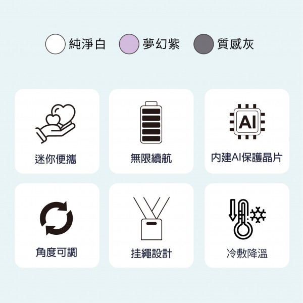 ●包裝清單:風扇×1、USB-C充電線 ×1、說明書 ×1、掛繩×1